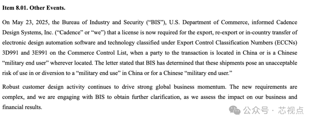Cadence在最新发布的公告称,在2025年5月23日,美国商务部工业与安全局(“BIS”)通知Cadence设计系统公司(“Cadence”或“我们”),现在,如果交易一方位于中国境内或为中国“军事最终用户”(无论其位于何处),则出口、再出口或在国内转让商务管制清单上出口管制分类号 (ECCN) 3D991 和 3E991 下的电子设计自动化软件和技术,均需获得许可证。该信函指出,BIS 已认定这些货物在中国或中国“军事最终用户”的“军事最终用途”中使用或转用于中国构成不可接受的风险。 强劲的客户设计活动持续推动着全球业务的强劲增长势头。新的要求十分复杂,我们正在与美国商务部(BIS)接洽,以获得进一步的澄清,同时评估其对我们业务和财务业绩的影响。