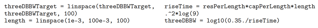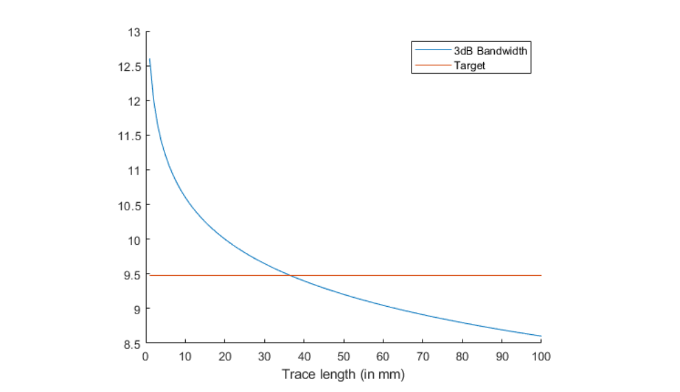 其中,ltr是走线长度。利用上述数据,我们可以推导出互连通道的 3dB 带宽与ltr的函数关系。该3dB带宽与目标3dB带宽的对数图如下: