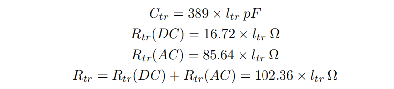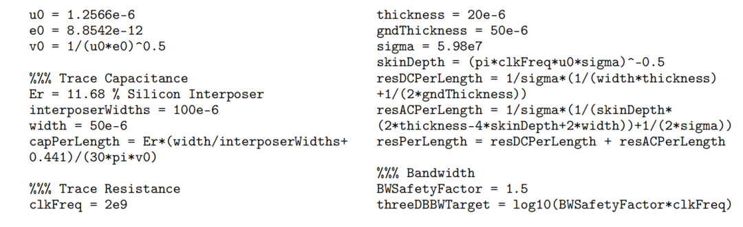 其中,Rtr和Ctr是走线的等效电阻和电容,这些参数取决于走线尺寸和基板(中介层)材料。我们的目标是找出能够满足带宽目标的最大走线长度。根据这些模型计算得出: