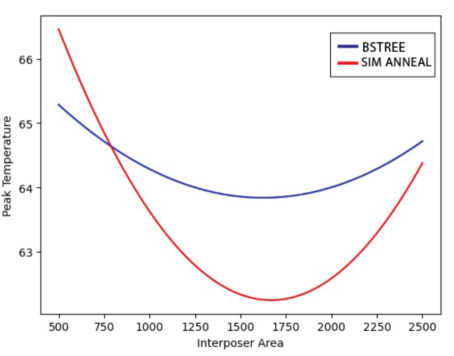 • 实施:记录初始二叉搜索树布局的峰值温度趋势,并与通过自定义模拟退火算法得出的优化布局进行比较。优化后的峰值温度大幅下降,证明了在中介层上合理放置组件的策略是有效的。