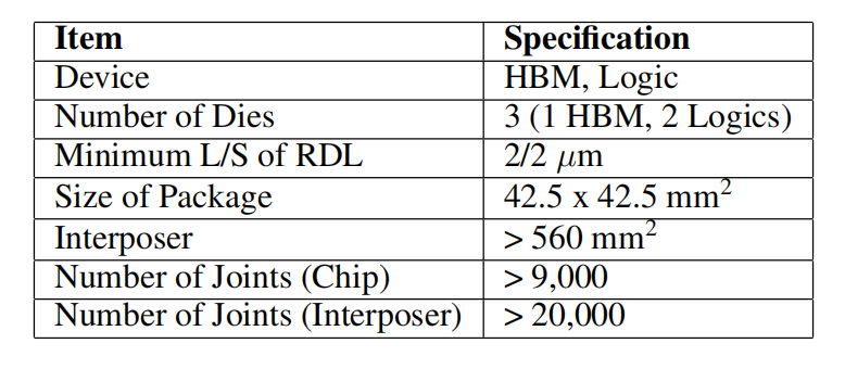 为验证2.5D RDL中介层的功能而进行的实验包括制造一个包含一个HBM和两个逻辑芯片的封装结构。封装的规格,包括尺寸、RDL最小线宽/间距和连接点数量,都对其有效性起到了重要作用。所提出的制造过程包括RDL制造、多芯片键合、封装、芯片暴露、焊球附着以及中介层在基板上的组装。