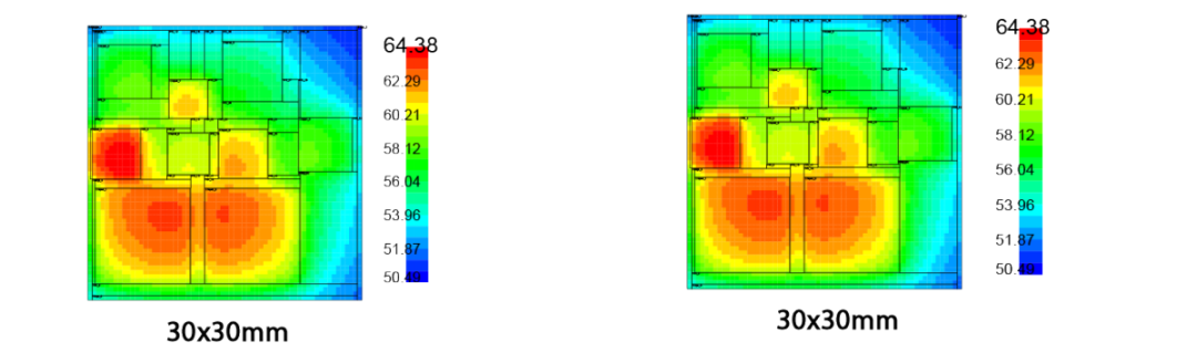 模拟场景包括对一个简单封装的原始布局进行建模,然后在相同的运行条件下对更细分的小芯片式布局进行建模。随时间变化的稳态温度显示,小芯片式配置的最高温度显著降低了超过2K,证实了小芯片在散热性能上的提升。