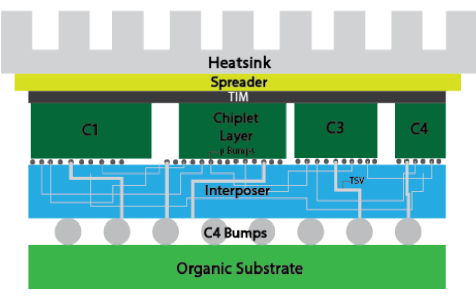 • 带有硅通孔(TSV)的中介层:作为小芯片之间的桥梁,便于通信;它包含用于不同层之间垂直连接的TSV。由于无源中介层使用后端制程(BEoL)制造工艺,具有较低的热负载和制造简单的优点,因此选择无源中介层而非有源中介层。