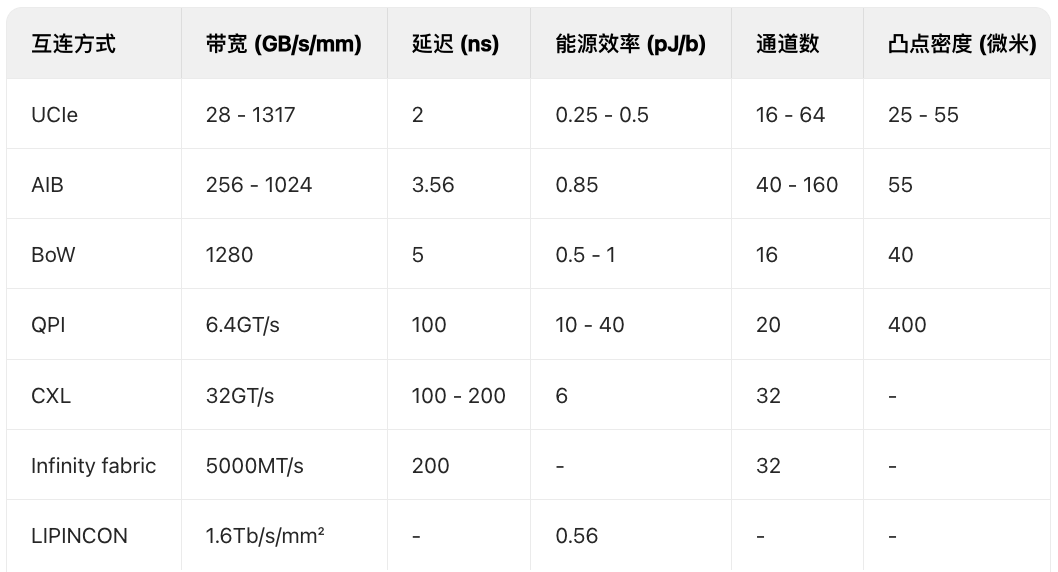 在基于小芯片的架构中,小芯片(Chiplet)之间的通信对于实现这些专门的、独立的半导体组件之间的协作和数据共享至关重要。它确保了整个系统的无缝运行,支持可扩展性和灵活性,优化了性能,并助力实现定制化且节能的设计。这种小芯片(Chiplet)间的通信对于构建能够适应不同需求的复杂高性能微电子系统而言必不可少。多年来,AMD、Arm、ASE、谷歌、英特尔、Meta、微软、高通、三星和台积电等领先的半导体企业提出了各种互连技术和架构。我们整合了其中较为突出的技术,并在中期评估中进行了阐释。我们在下表中总结了这些互连技术的参数,并以此为依据提出了我们建议的互连方案。