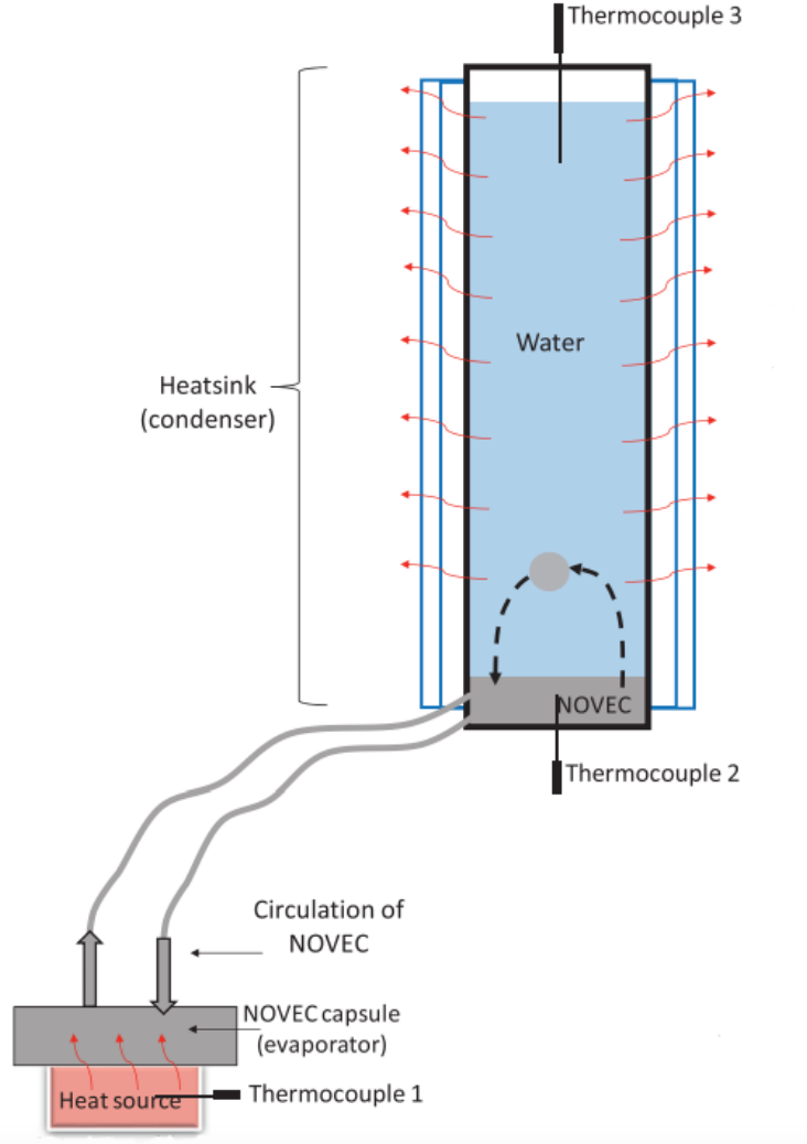 微流体通道连接到装有水的冷凝容器,蒸发的Novec在穿过水柱时迅速冷却并变回液态,释放出热量。水中积累的热量通过充当散热器的容器被动地散失到环境中。Novec蒸汽气泡的快速热传输确保即使整个系统在没有外部动力或泵驱动回路的情况下被动运行,也能实现有效的热通量。该系统利用Novec的低蒸发温度提高冷却效率,并利用蒸汽的浮力流动实现快速的流体运动。冷凝器基于水池设计,Novec气泡在其中有效冷凝,且不受不可凝气体的影响,水的剧烈搅动增加了向壁面的热传递。