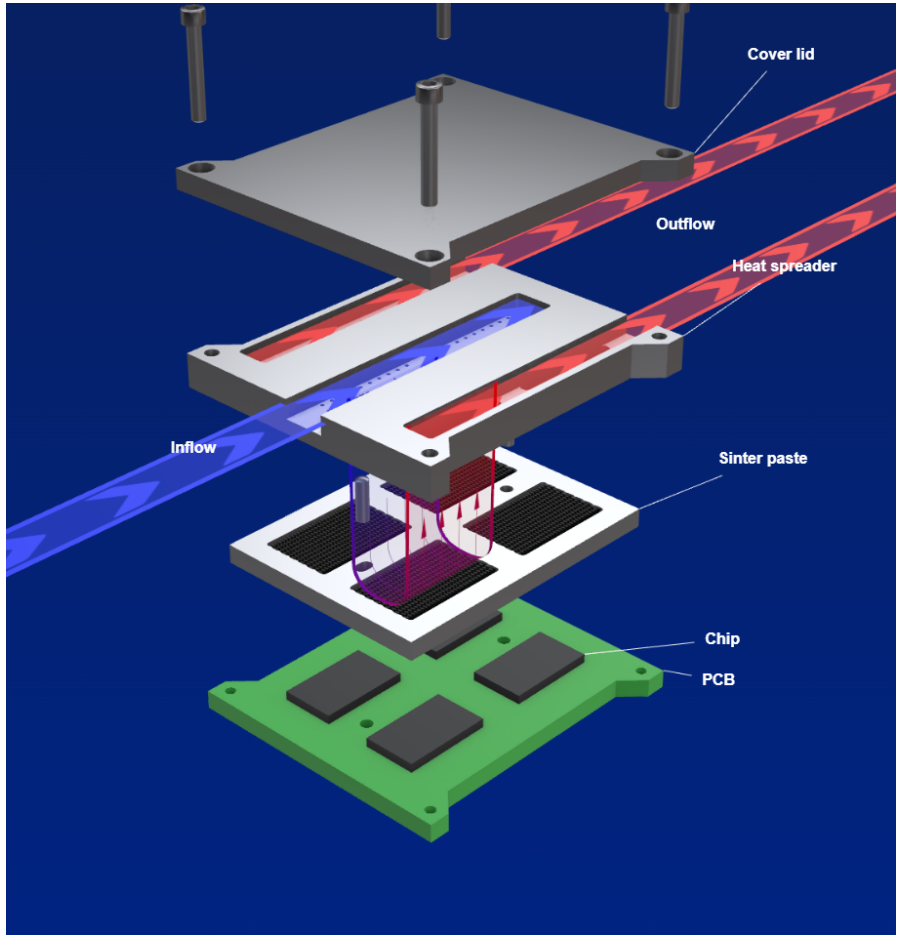 设计为小芯片生态系统一部分的微流体系统展现出卓越的冷却性能。这不仅为我们围绕小芯片中的热热点设计最有效的微流体冷却回路提供了灵活性,而且带有两相冷却的被动冷却回路确保小芯片所有区域的最高稳态温度始终在安全阈值内。其他使用强制对流(液体或空气)的替代方案在从热源提取热量方面效率较低,并且需要为气流或散热器留出空间。我们的微流体通道采用两相冷却回路(由Novec 7000和水组成)。