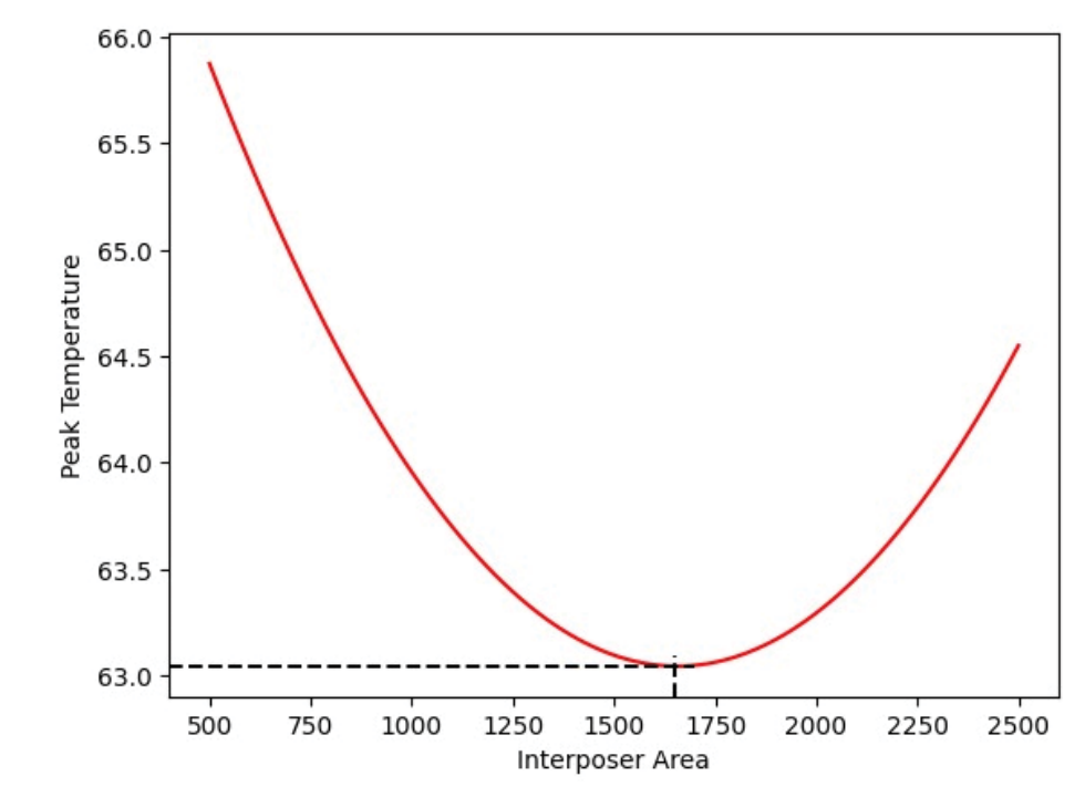 成本函数:我们通过逐步减小中介层面积进行迭代,以模拟可用面积对小芯片层峰值温度的影响。再次收集离散可行中介层尺寸的数据点,然后将其输入到多项式拟合函数中。得出在面积为1600cm2
