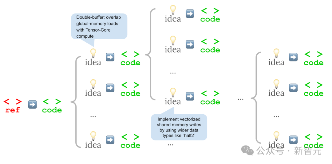 他们不再于每一步直接生成新的内核,而是以先前尝试过的思路为条件,用自然语言生成优化思路,随后将这些思路具化为新的代码变体。