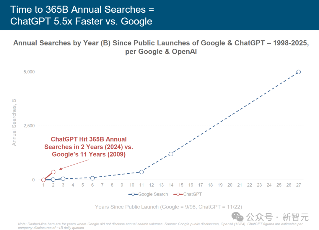 如今,OpenAI年度搜索量突破3650亿次的速度,达到谷歌的5.5倍。前者用了2年,后者却用了11年。