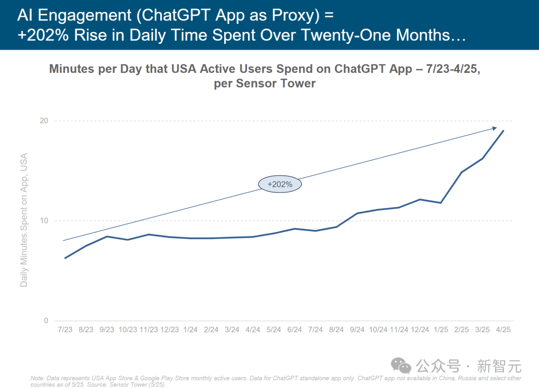 可以看到,ChatGPT的应用内使用时间,已经在两年内翻了一番。