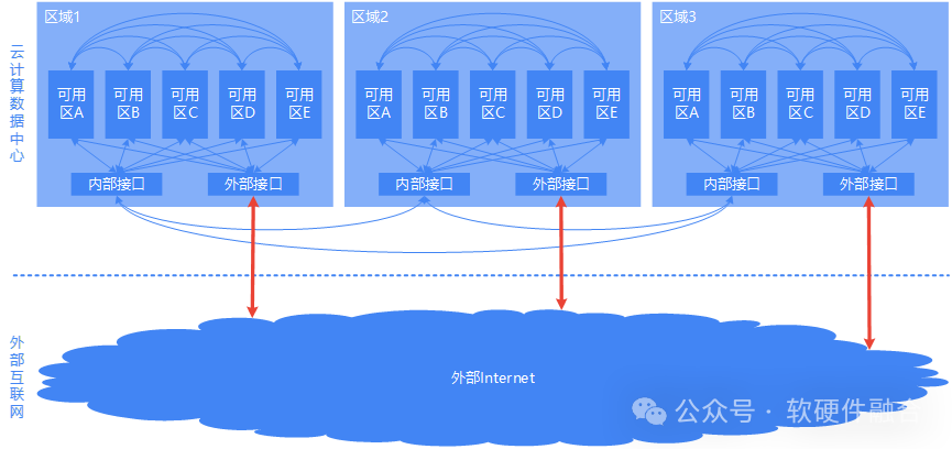 云-云连接:这和目前公有云跨区域(Region)和可用区(Zone)的网络连接方案一致。同一区域下所有可用区为全相联(所有数据中心均和其他数据中心有直接连接),然后所有的区域为全相联。