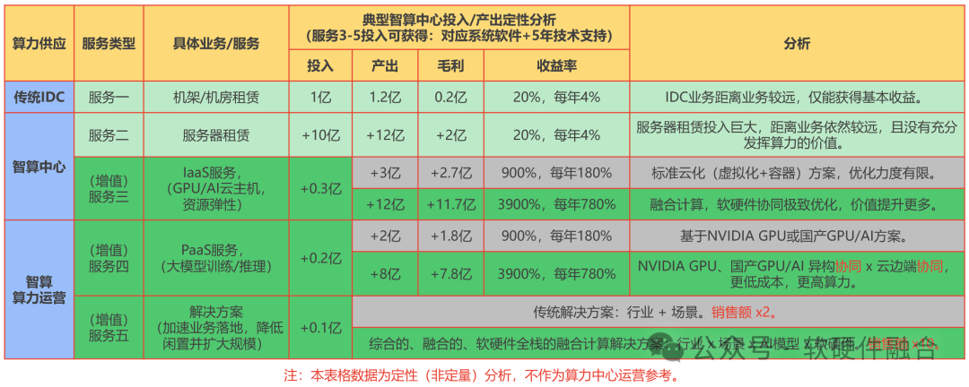 如上图表格所示,我们对智算中心的业务(服务)类型以及相关的资金投入进行了一个定性的分析(注意:此表格数据非定量分析,不作为算力中心投资和运营参考),相对硬件投入的资金量,IaaS、PaaS等软件的投入量仅占5%左右,几乎可以忽略不计。