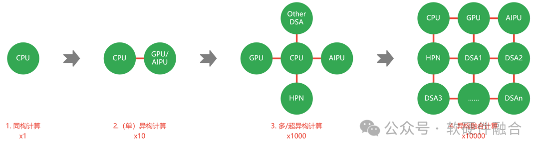 随着CPU逐渐性能瓶颈,GPU也越来越难以扛起算力提升的大旗,势必需要更多的加速计算处理器来实现算力的提升。计算架构从同构到异构,再从异构到多异构和异构融合。