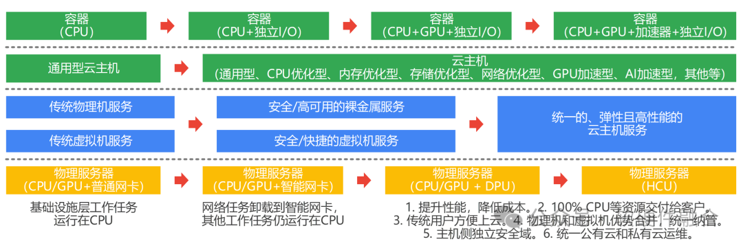 云主机,是最核心的服务,也是其他服务的承载之所在。我们以云主机为例,当前大家能够实现的通常是最传统的物理机和虚拟机服务。通过软硬件协同的优化,能够把云基础设施层任务进一步卸载到DPU或更加综合的异构融合处理器,可以进一步降低成本提升系统的性能。此外,还可以统一物理机和虚拟机,让两者完全统一,客户的业务更流畅,算力供应商的运维管理更顺畅。
