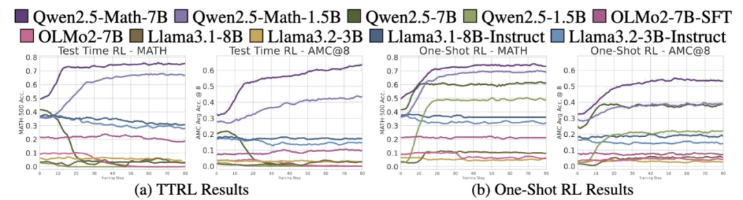 我们在多种基础模型上评估了最近提出的两种弱监督 RL 方法 ——TTRL 和单样本 RL。我们发现,这些提出的训练奖励在 Qwen 模型上能够持续奏效。然而,除了少数例外,这些相同的信号在其他模型家族上通常无法带来收益,这与我们使用虚假奖励进行训练时观察到的有限泛化能力相呼应。