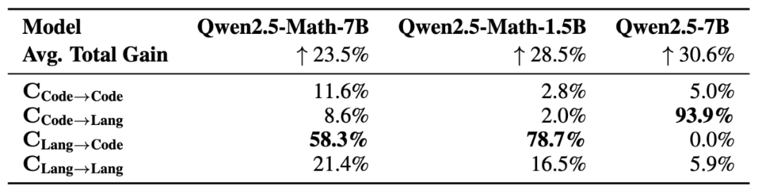 我们进一步量化了每种策略转换行为对每个模型性能增益的贡献。看到这一点非常酷:如果一个模型擅长代码推理(代码准确率 > 语言准确率),RLVR 的增益主要来自于从语言到代码推理的转换;如果一个模型不擅长代码推理(代码准确率 < 语言准确率),RLVR 的增益则主要来自于从代码到语言推理的转换。