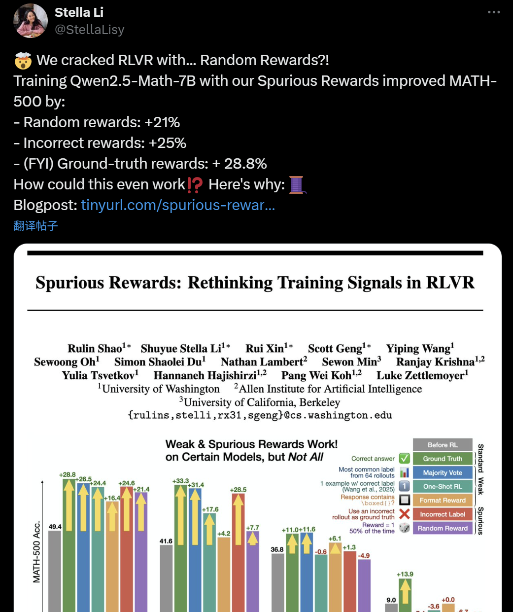我们发现,RLVR 可以通过所谓的「虚假奖励」—— 提供极少甚至误导性指导的信号,大幅提升数学推理能力。