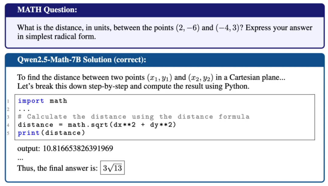 Qwen2.5-Math-7B 的代码推理回应示例。该问题从 MATH-500 测试集中随机选取。请注意,代码及其执行结果均由 Qwen2.5-Math-7B 自回归生成 。并未向模型提供外部代码解释器。
