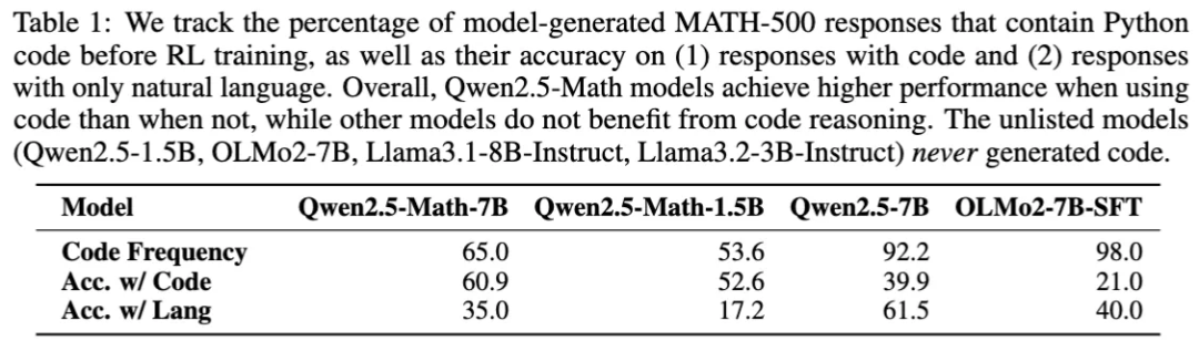 通过仔细分析,我们发现了一个关键洞察:即使在进行 RLVR 训练之前,Qwen-Math 也有 65.0% 的时间会生成 Python 代码来解决数学问题。更惊人的是,在没有代码执行器的情况下,它常常能生成正确的代码输出以及问题的正确答案。