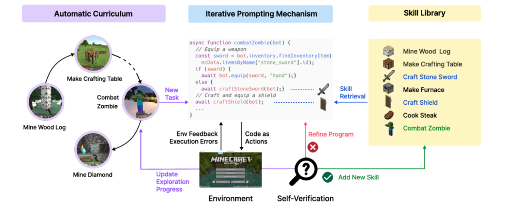 Voyager智能体包含三个核心组件:自动学习路径、迭代提示机制和技能库。