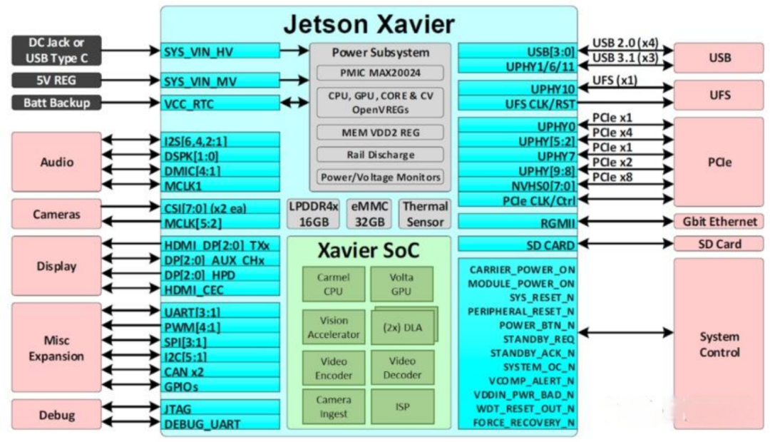 Jetson Xavier:专为机器人设计的计算平台,其中,Xavier SoC芯片内部集成超90亿颗晶体管,可实现每秒超30万亿次浮点运算。该芯片搭载六种高性能处理器,包括 Volta 架构 Tensor 核心 GPU(1个)、八核心 ARM64 CPU(1个)、 深度学习加速器DLA(2个),以及图像处理器(1个)、视觉加速器(1个)和视频编码器和解码器(各1个)。凭借强大的硬件配置,Jetson Xavier 能够同时实时运行数十种算法,覆盖传感器处理、测距、定位与绘图、视觉感知及路径规划等多种任务。