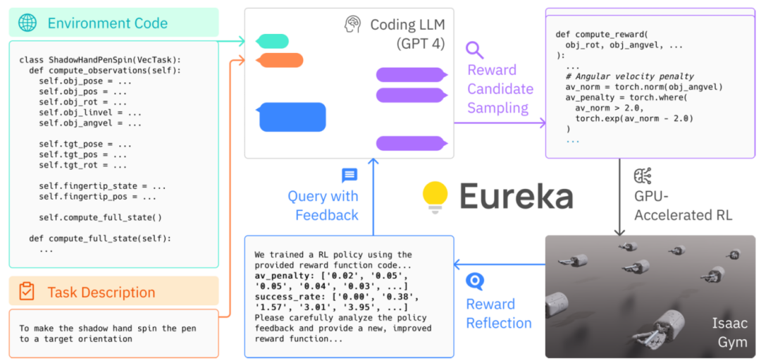 2023年10月,英伟达在GTC 大会上发布了Eureka。Eureka是一个专注于机器人训练的 AI 系统,主要功能是利用生成式 AI 和强化学习方法,自动生成和优化奖励函数,以提高机器人的训练效率和性能。