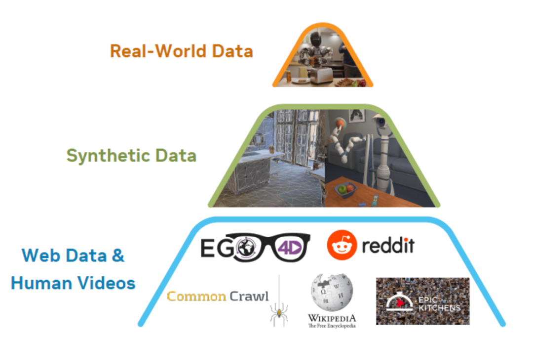 GR00T N1模型预训练所使用的数据:真实机器人轨迹、合成数据以及人类视频。