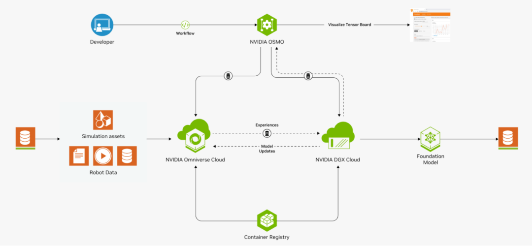 OSMO:是一种云原生的工作流编排平台,用于在本地、私有云和公有云中扩展复杂、多阶段和多容器的机器人工作负载,有助于用户在Isaac 平台上编排、可视化和管理一系列机器人开发任务。其中包括生成合成数据、训练模型、进行强化学习,以及为人形机器人、自主移动机器人 (AMR) 和工业机械手实施软件在环测试等。