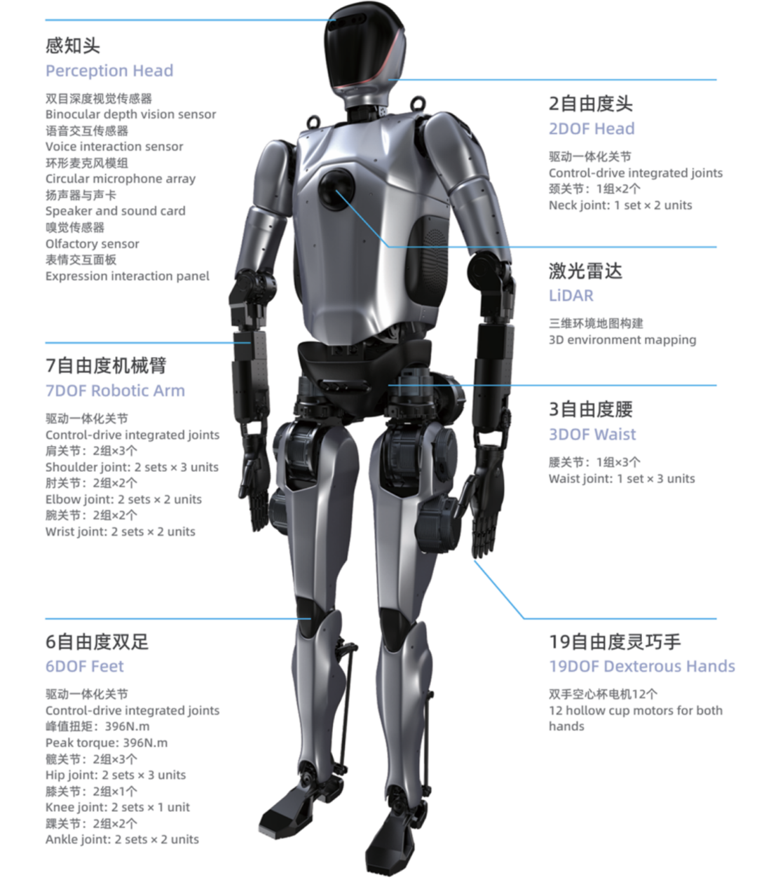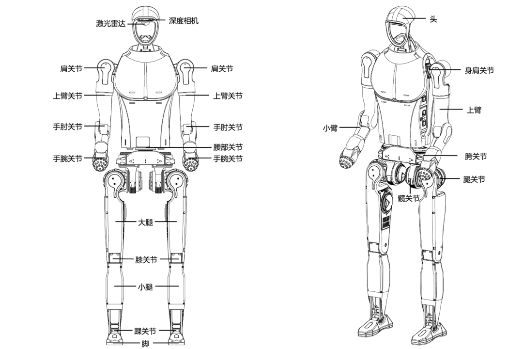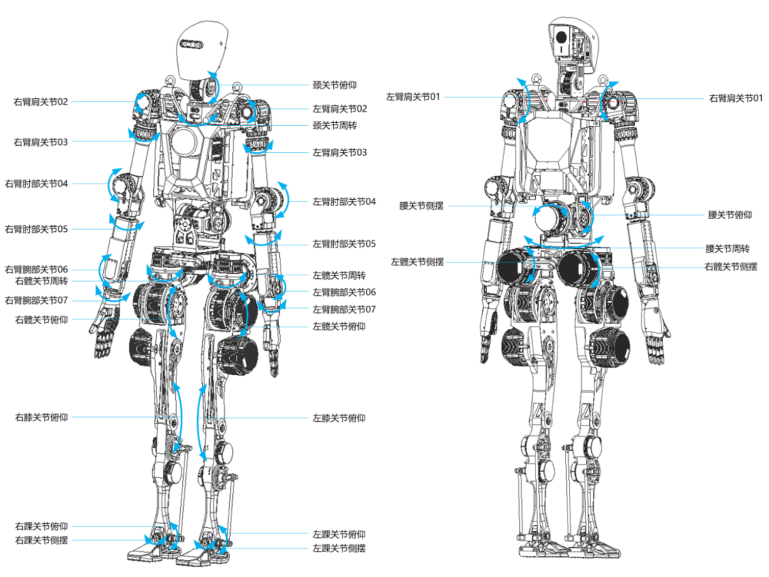 灵犀X1身高130cm,重量33kg,主动自由度达31个。另外,其全身包含29个关节(R86-2*9、R86-3*6、R52*10、L28*4)和2个夹爪,支持扩展头部3自由度。