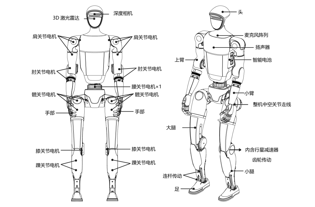 G1整机根据版本不同,可以分为 G1 和G1-EDU两个版本。其中,G1基础版本拥有23 自由度,G1-EDU版本拥有23~43 自由度。