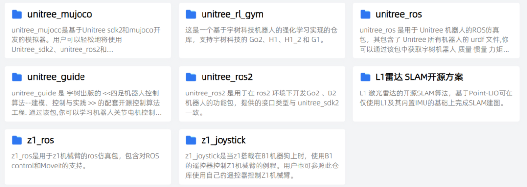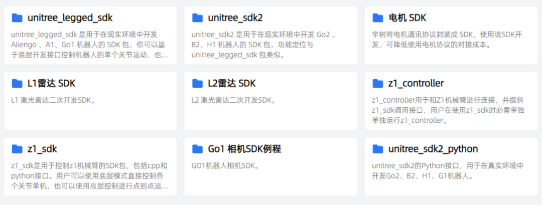 Unitree_legged_sdk、Unitree_sdk2、电机SDK、L1雷达SDK、、L1雷达SDK、L2雷达SDK、z1_controller、z1_sdk、Unitree_sdk2_python。
