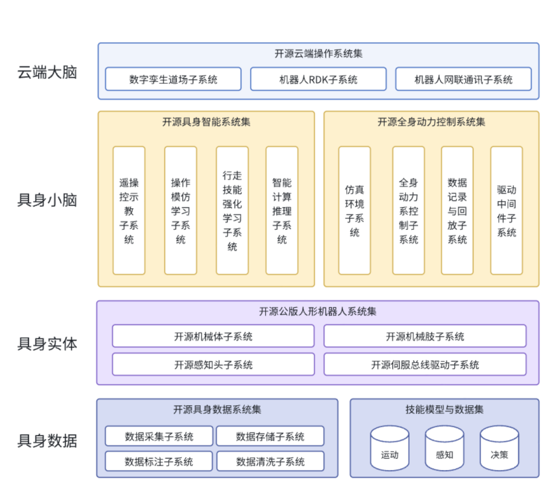 OpenLoong项目开源内容涵盖:硬件、具身智能操作系统、全身动力学控制和数据集四大板块,目前正逐步开放。