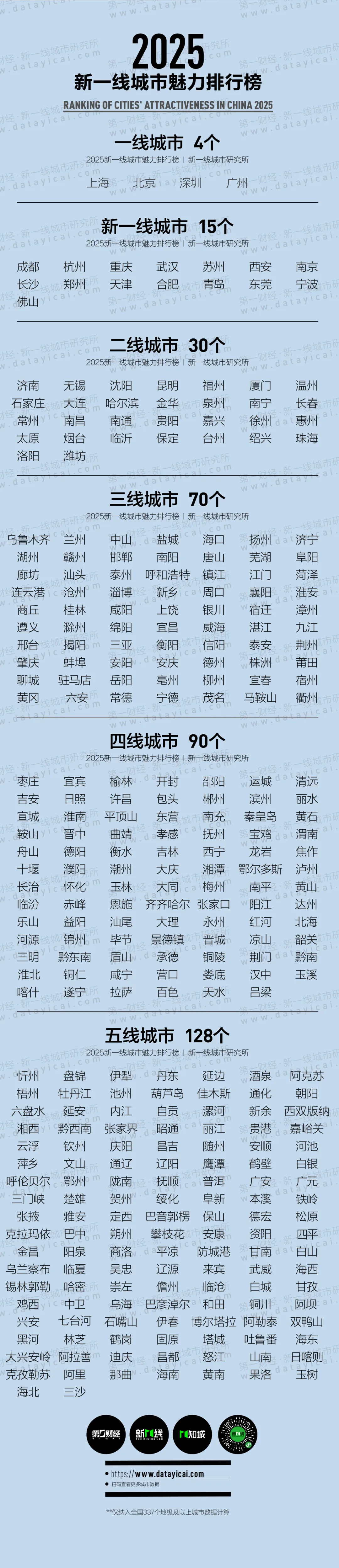 最近,第一财经公布《2025新一线城市魅力排行榜》,榜单将中国337个地级及以上城市,在商业资源集聚度、城市枢纽性、城市人活跃度、新经济竞争力和未来可塑性五大“科目”上的表现,进行了各项评分并综合排序。