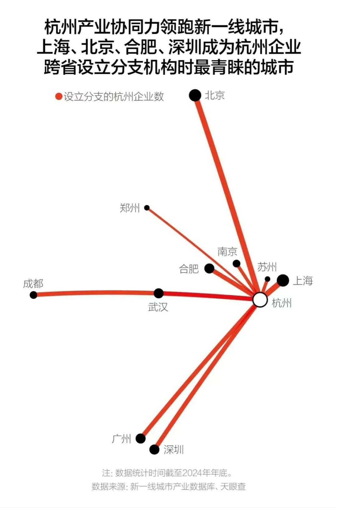 而且,杭州在产业协同上已领跑新一线城市,特别是创新型企业的布局。根据第一财经数据,上海、北京、合肥、深圳成为杭州企业跨省设立分支机构时最青睐的城市。