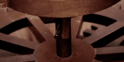 水车和主轴相连,水流经过,水车旋转,主轴跟着旋转,锤子就可以动起来了。