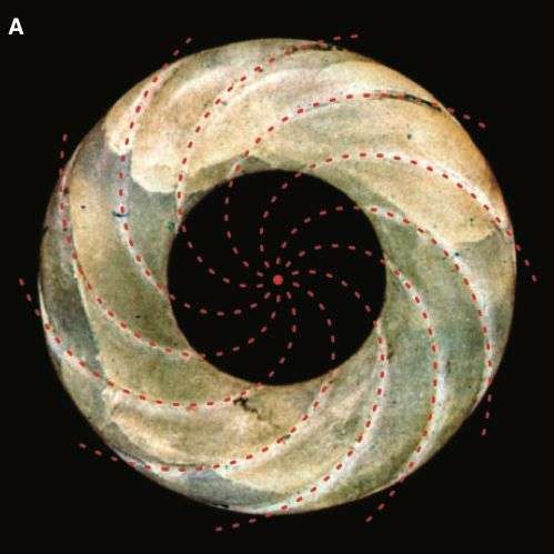 是这样的,上面玉石首饰中的纹路叫做等速螺线,也叫阿基米德螺线。