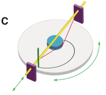 那么,制造这种等速螺线的复合机是什么样的呢?可能是下面这样的。绿色的是笔,白色的是玉石。拉动黄色的杆子,就能画出等速螺线。