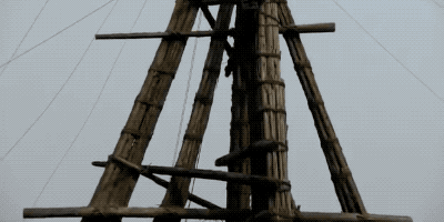 井架是用耐用的竹子做的,钻头是用绳索吊起来的。