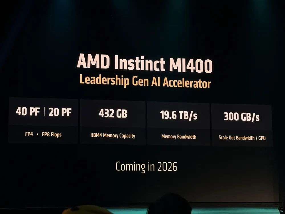 2、数据中心AI芯片AMD Instinct MI400系列(明年推出):专为大规模训练和分布式推理而设计,将FP4精度下峰值算力翻倍提升至40PFLOPS,FP8峰值性能达到20PFLOPS,搭载432GB HBM4内存,内存带宽达到19.6TB/s,每GPU横向扩展带宽达到300GB/s,可实现跨机架和集群的高带宽互连,旨在训练和运行拥有数千亿和万亿级参数的大模型。