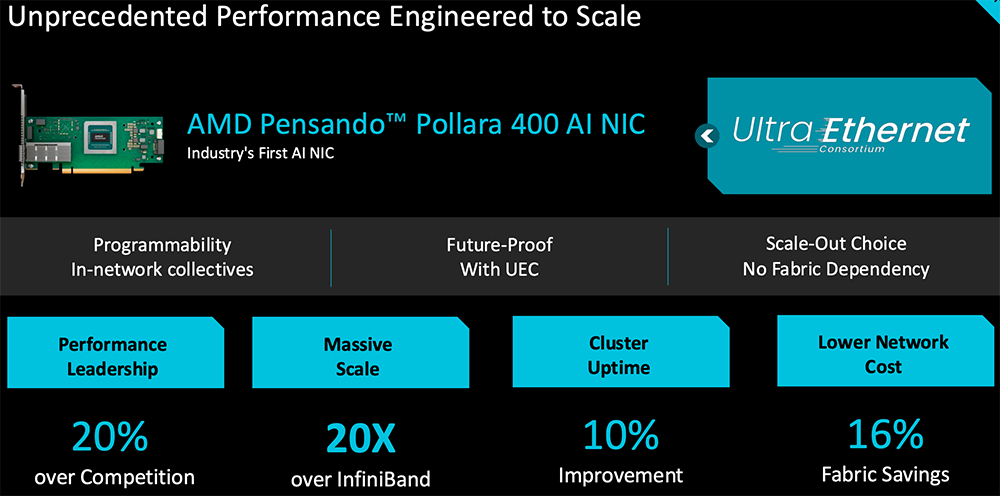 网络对于构建机架级规模的AI系统至关重要。为了扩大网络规模,AMD去年推出了Pensando Pollara 400 AI NIC。该NIC现可在MI350系统里大规模部署。