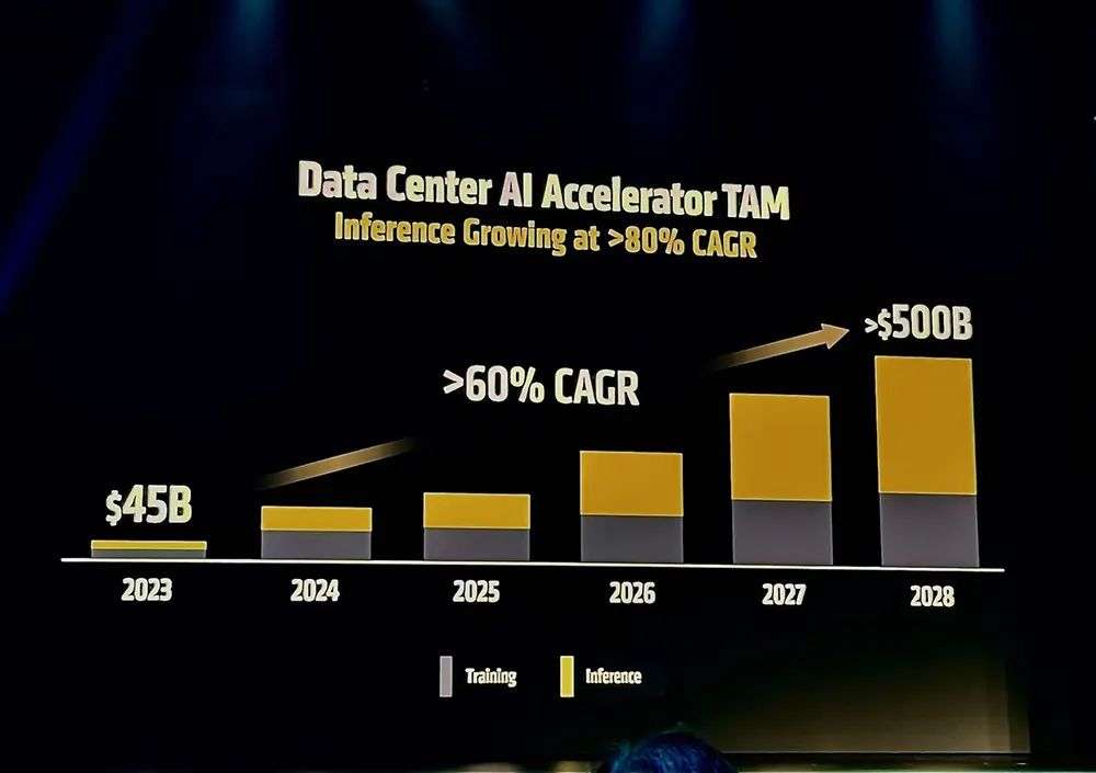 据苏姿丰博士分享,数据中心AI加速器TAM市场将每年增长60%以上,到2028年达到5000亿美元,预计推理将在未来几年内每年增长80%以上,成为AI计算的最大驱动力。