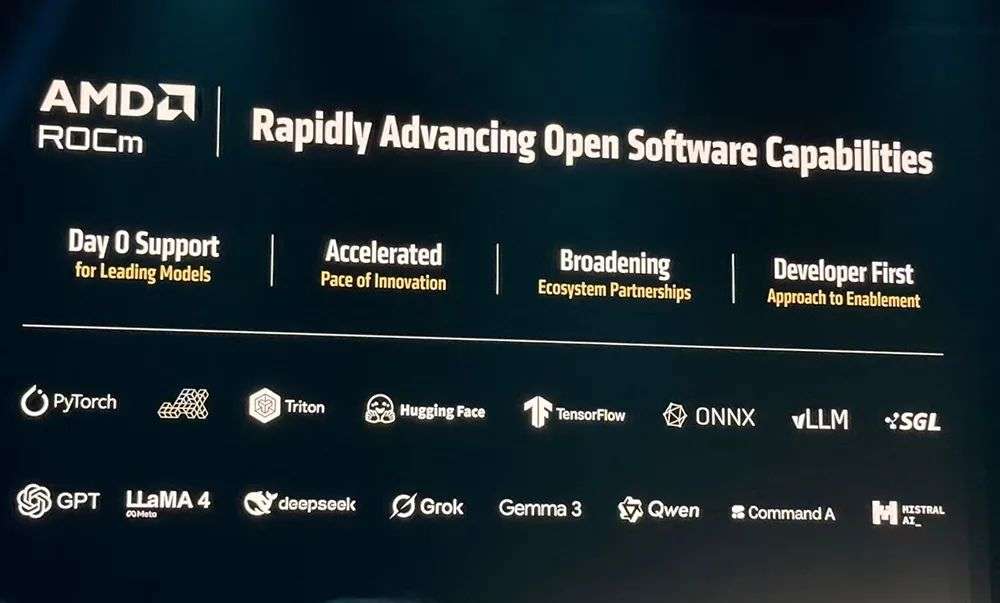 AMD ROCm软件生态系统持续优化推理和训练性能,对Llama、DeepSeek等主流模型实现Day 0级支持,将发布节奏从每季度加快到每两周,持续改善开发者的开箱即用体验。