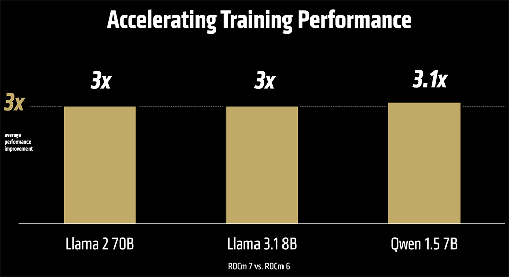 相比ROCm 6,ROCm 7在相同硬件上训练Llama 2 70B、Llama 3.1 8B、Qwen 1.5 7B等开源模型,可实现3~3.1倍的性能提升。
