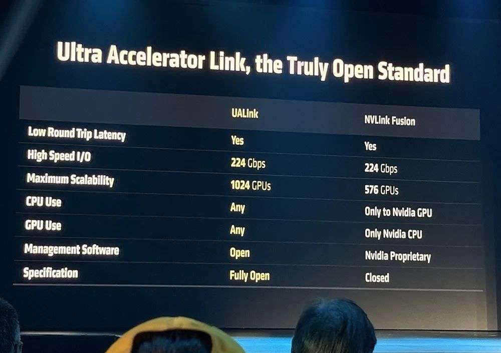 去年成立的UALink(Ultra Accelerator Link)联盟旨在扩展将AI芯片网络规模,提供更高的带宽、更低的延时。与英伟达NVLink相比,UALink完全开放,由100多个联盟成员支持,意味着客户可以使用任何GPU、任何CPU和任何交换机来扩展他们的架构。