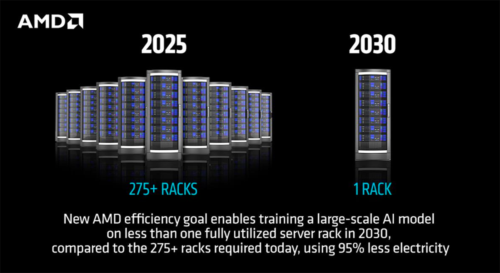 现在,AMD又设定了一个新的2030年目标,即在2024年的基础上,将机架规模的能源效率提高20倍(几乎是之前行业效率的3倍),使目前需要超过275个机架的典型AI模型到2030年能够在一个机架内进行训练,同时减少95%的运营用电量,将模型训练的碳排放量从约3000公吨减少到100公吨。