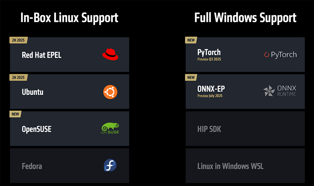 ROCm将支持In-Box Linux,并首度支持Windows操作系统。预计从2025年下半年开始,ROCm将出现在主要的发行版中,将Windows定位为一流的、得到全面支持的操作系统,确保家庭和企业设置的可移植性和效率。