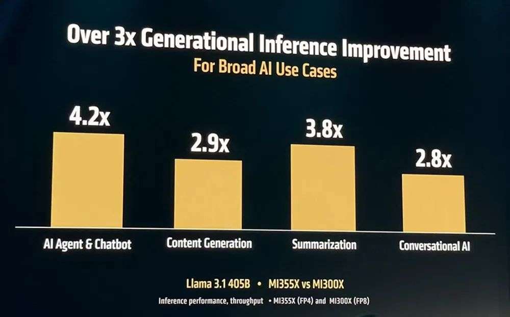 推理方面,当运行Llama 3.1 405B大模型,执行AI Agent与聊天机器人、内容生成、摘要总结、对话式AI等广泛AI用例时,相比上一代MI300X,MI355X能实现2.6倍~4.2倍的推理性能提升。