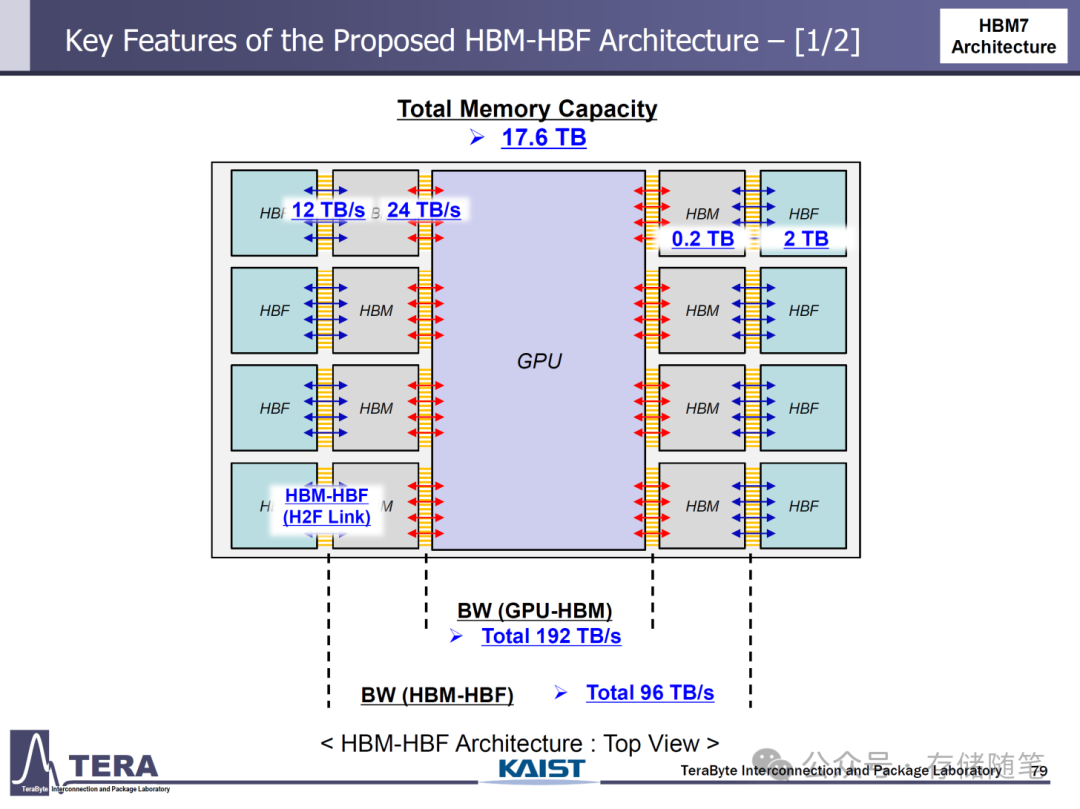为了满足内存密集型大语言模型(LLM)推理的需求,HBF(High - Bandwidth Flash)架构应运而生。HBF架构使用多达128层的NAND闪存,通过HBF TSV解决方案实现16层堆栈的高容量存储。每个HBF堆栈与HBM堆栈并行连接,可额外提供高达1TB的容量,并通过2TB/s的高速HBM - HBF互连与主板上的其他组件通信,该互连通过128GB/s的双向互连和内存网络交换机实现。