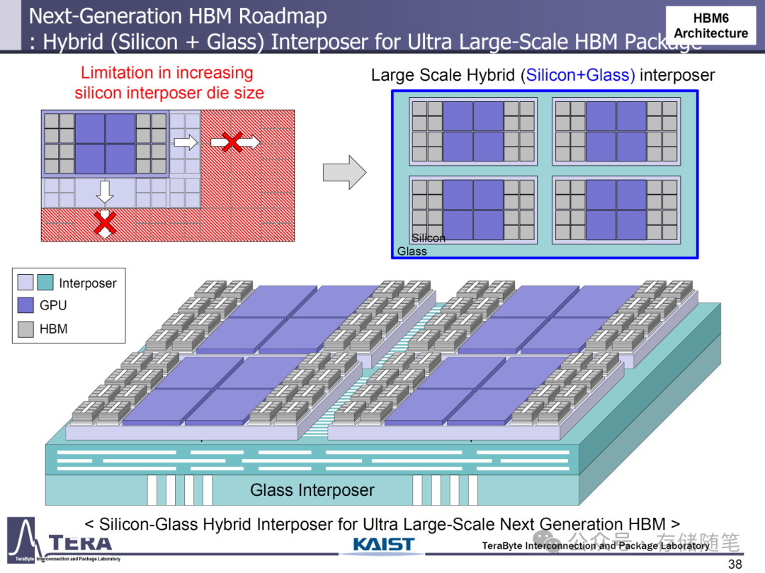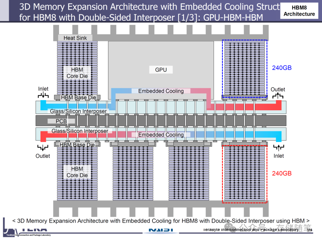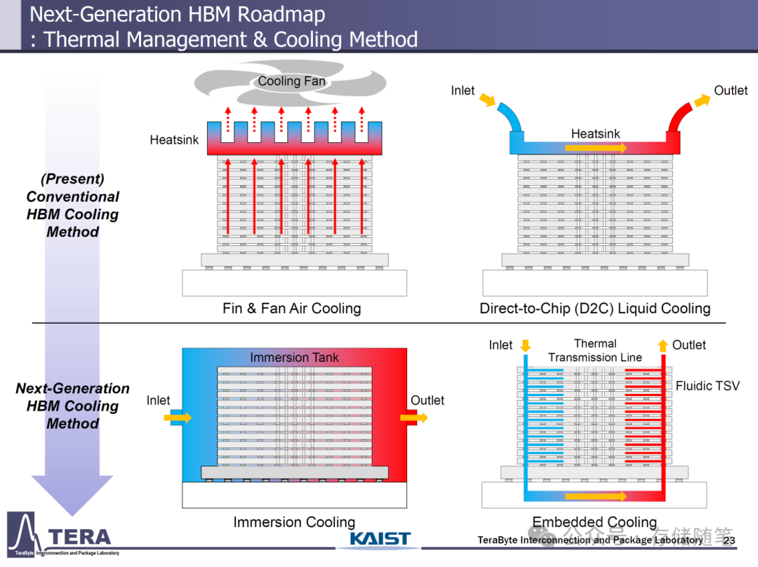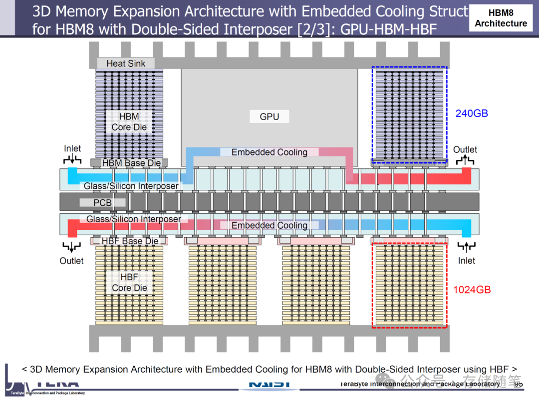 在冷却技术方面,随着玻璃基硅中介层的应用,嵌入式冷却将成为标准方法。这种冷却方式将通过中介层,为HBM、HBF和GPU IP提供直接冷却,有效解决高功耗带来的散热问题。
