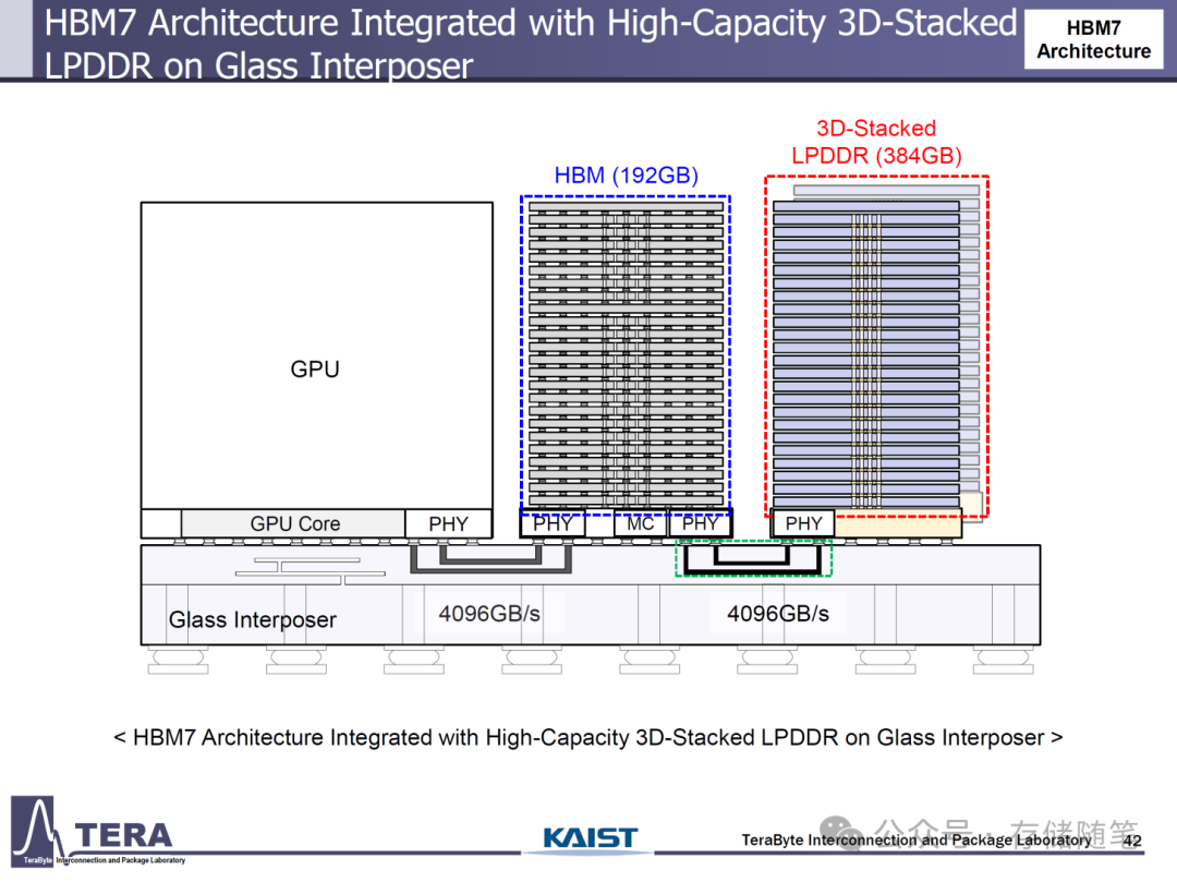 随着HBM7的发展,基于NAND的HBF堆栈将进一步升级,通过4096GB/s的传输速度连接到玻璃中介层。同时,高达384GB容量的LPDDR解决方案将与192GB容量的HBM堆栈协同工作。HBM7和HBM8还将采用24层堆栈设计,形成双塔高带宽封装。